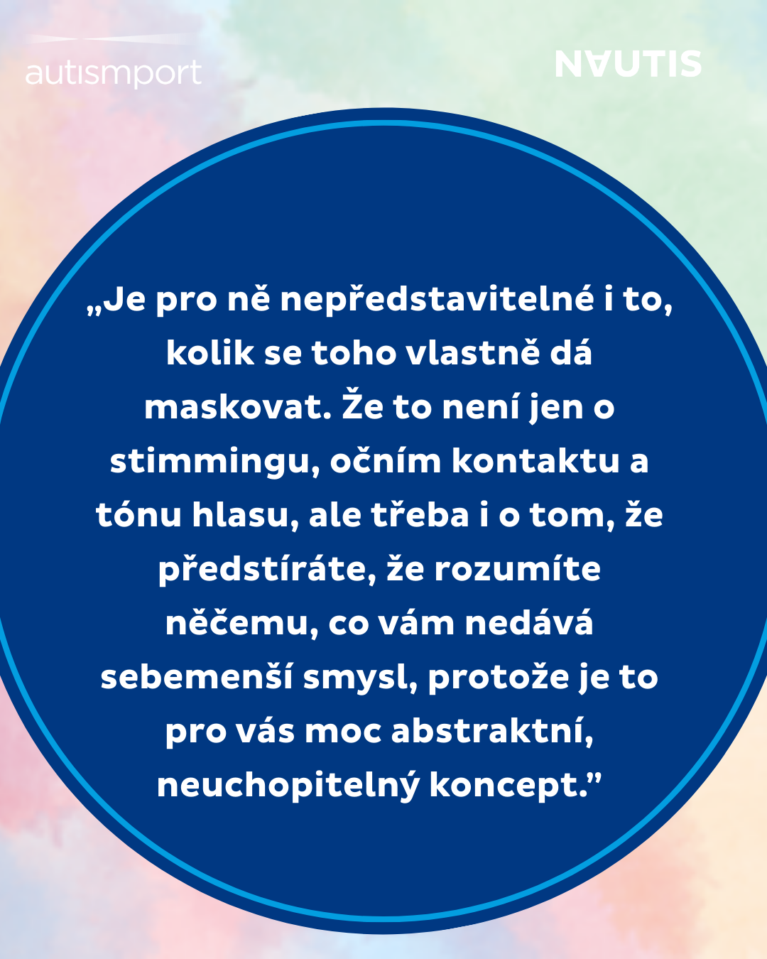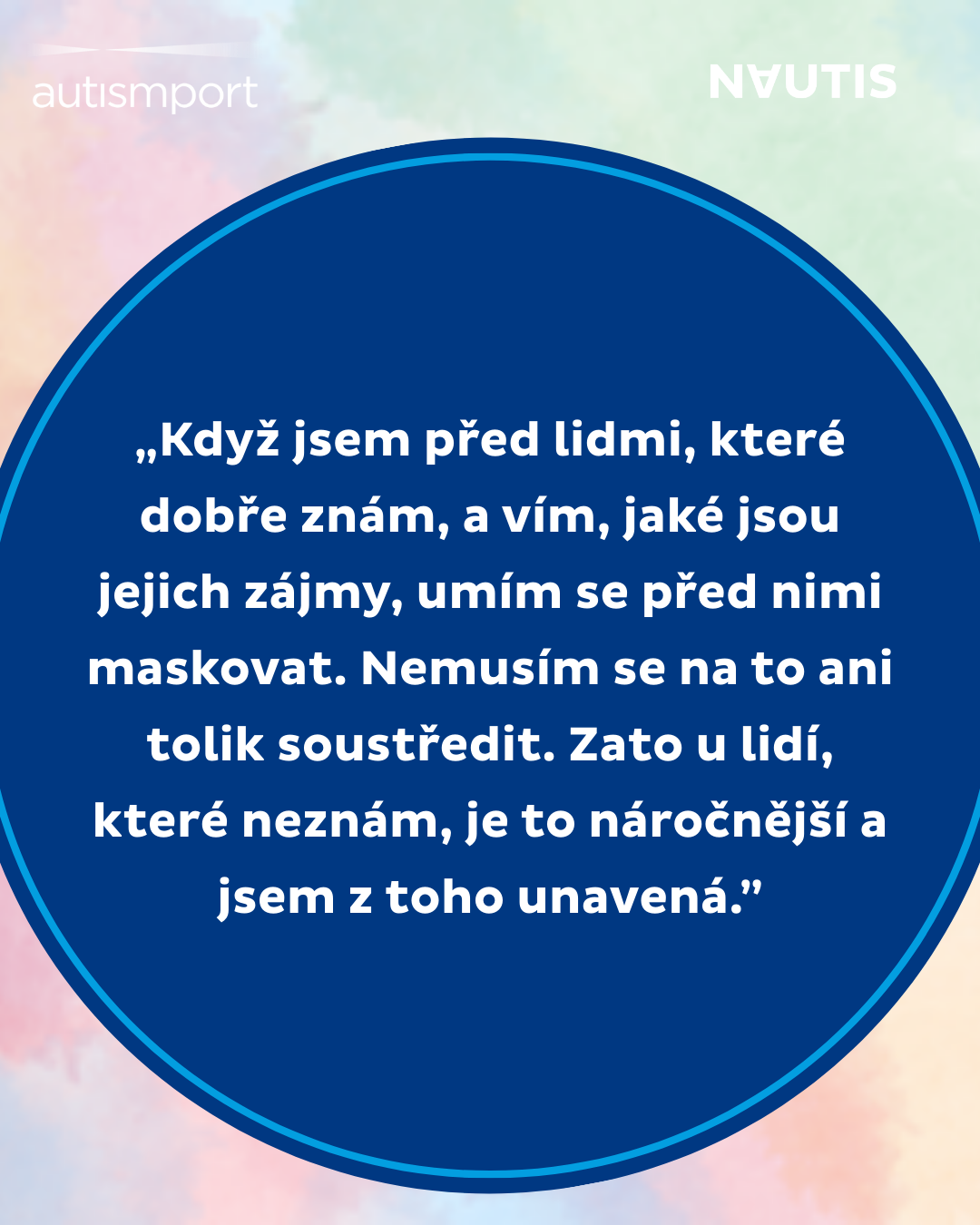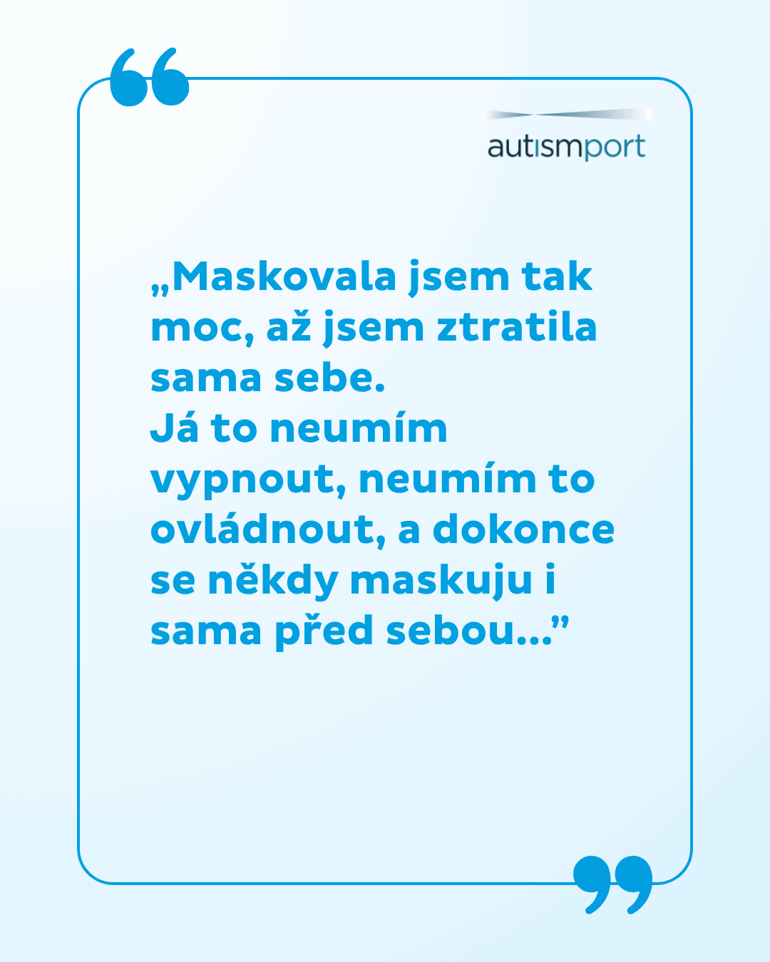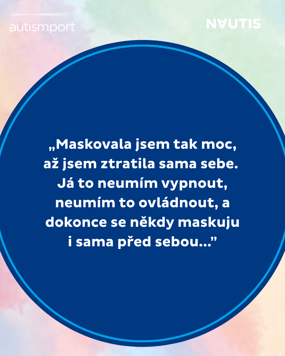 „Maskování je strategie nebo způsoby chování, které používají lidé s autismem, aby zamaskovali projevy, které jsou typické pro autismus. Dělají to proto, aby zapadli do neurotypické společnosti, aby vyhověli očekáváním okolí a doporučením, která slýchávají od malička od učitelů, přátel… Člověk s autismem potom může v podstatě ztratit představu, co je jeho autentické já.“