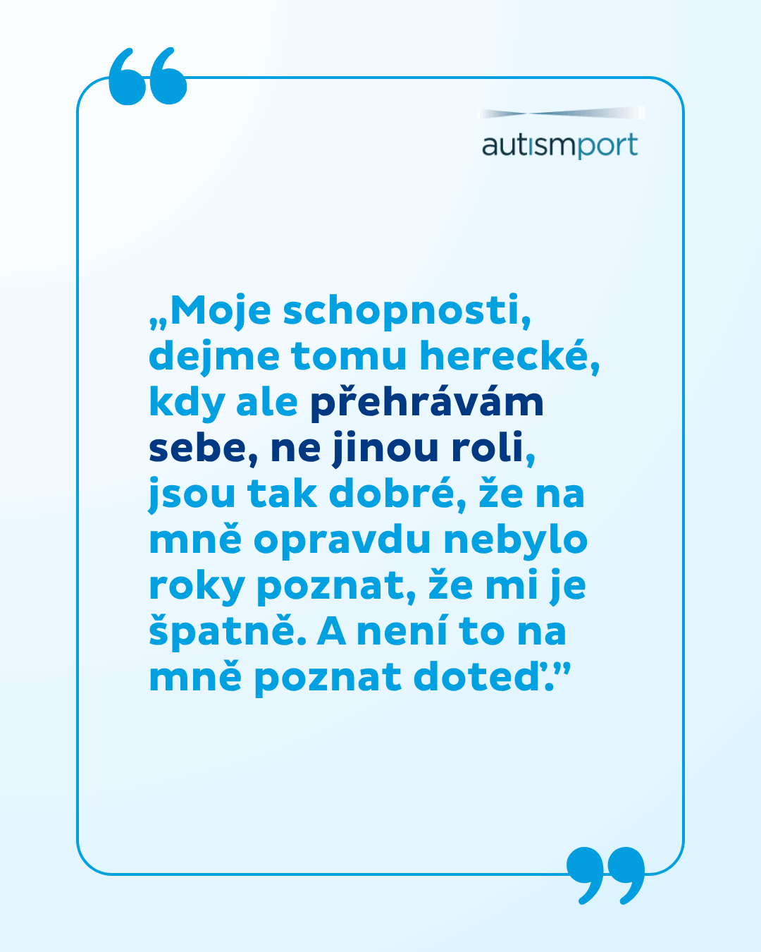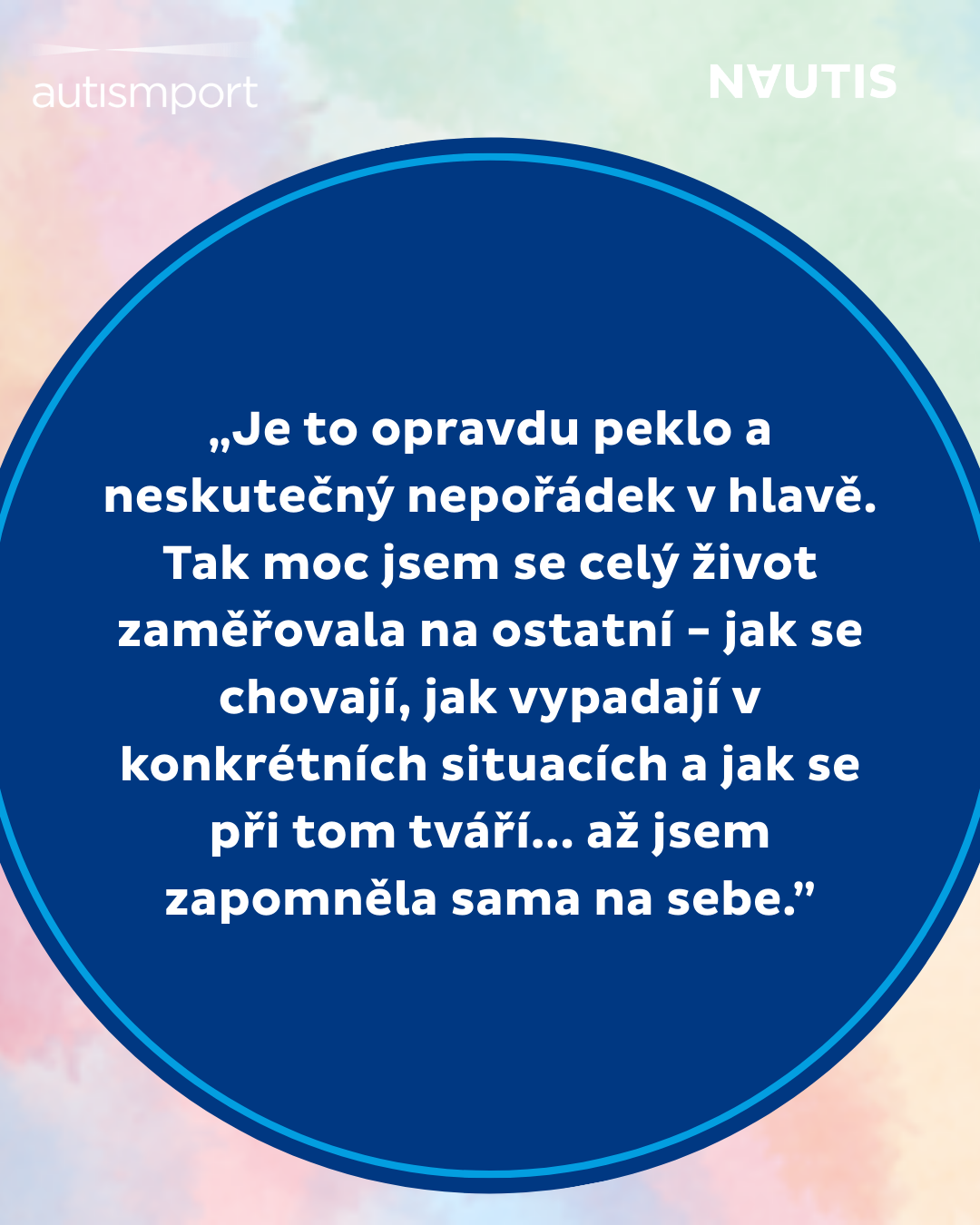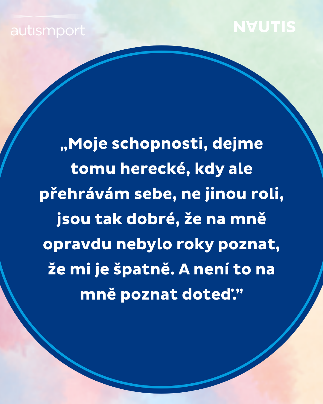 „Diagnóza autismu mi pomohla si tyto odlišnosti uvědomit a pochopit je, a taky je přijmout jako součást mé osobnosti. Snažím se, abych se necítila trapně nebo méněcenně, když se můj autismus ,projeví´. Autistické chování může být i užitečné, upozorní ostatní, aby mi dali víc prostoru nebo mě víc podpořili a pro mě je to signál toho, že je zapotřebí se začít víc hlídat a využívat strategie, které mi pomáhají předejít zhroucení.