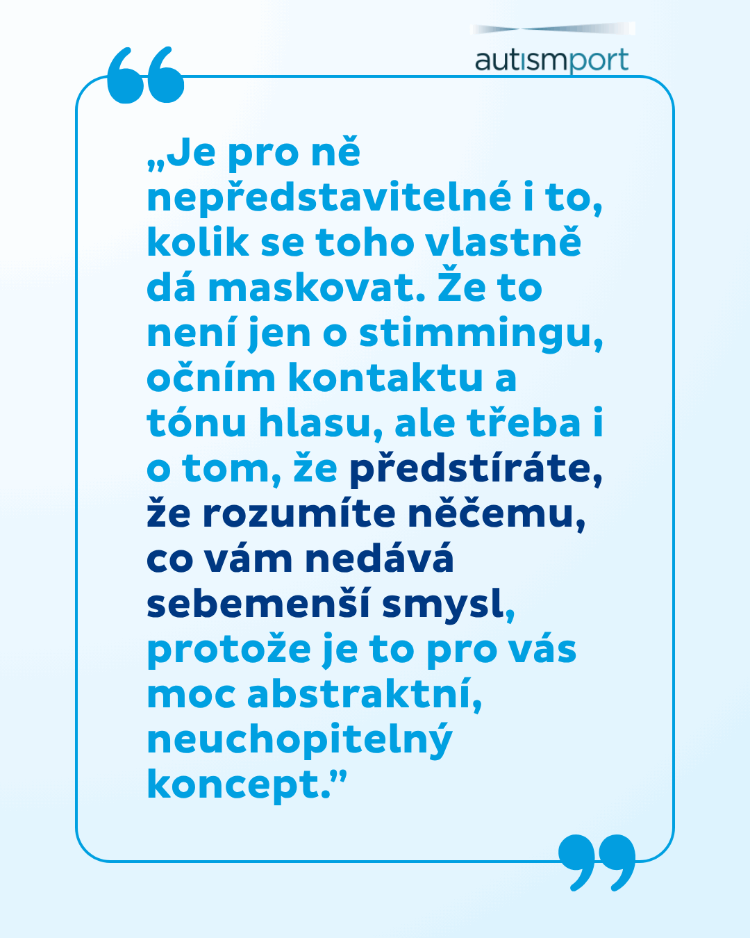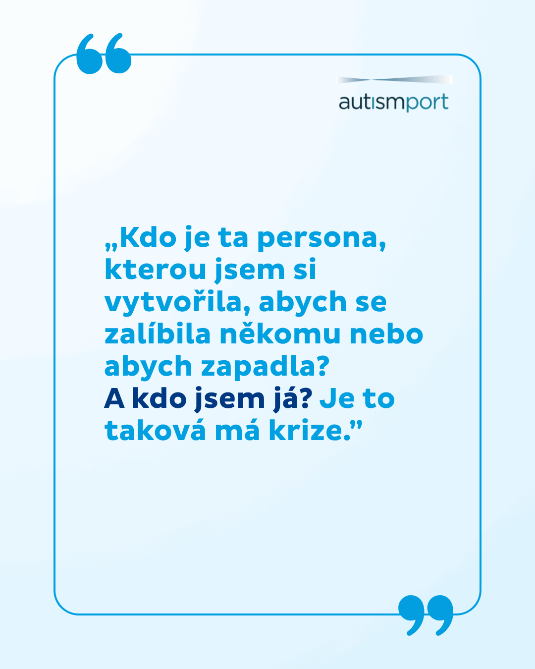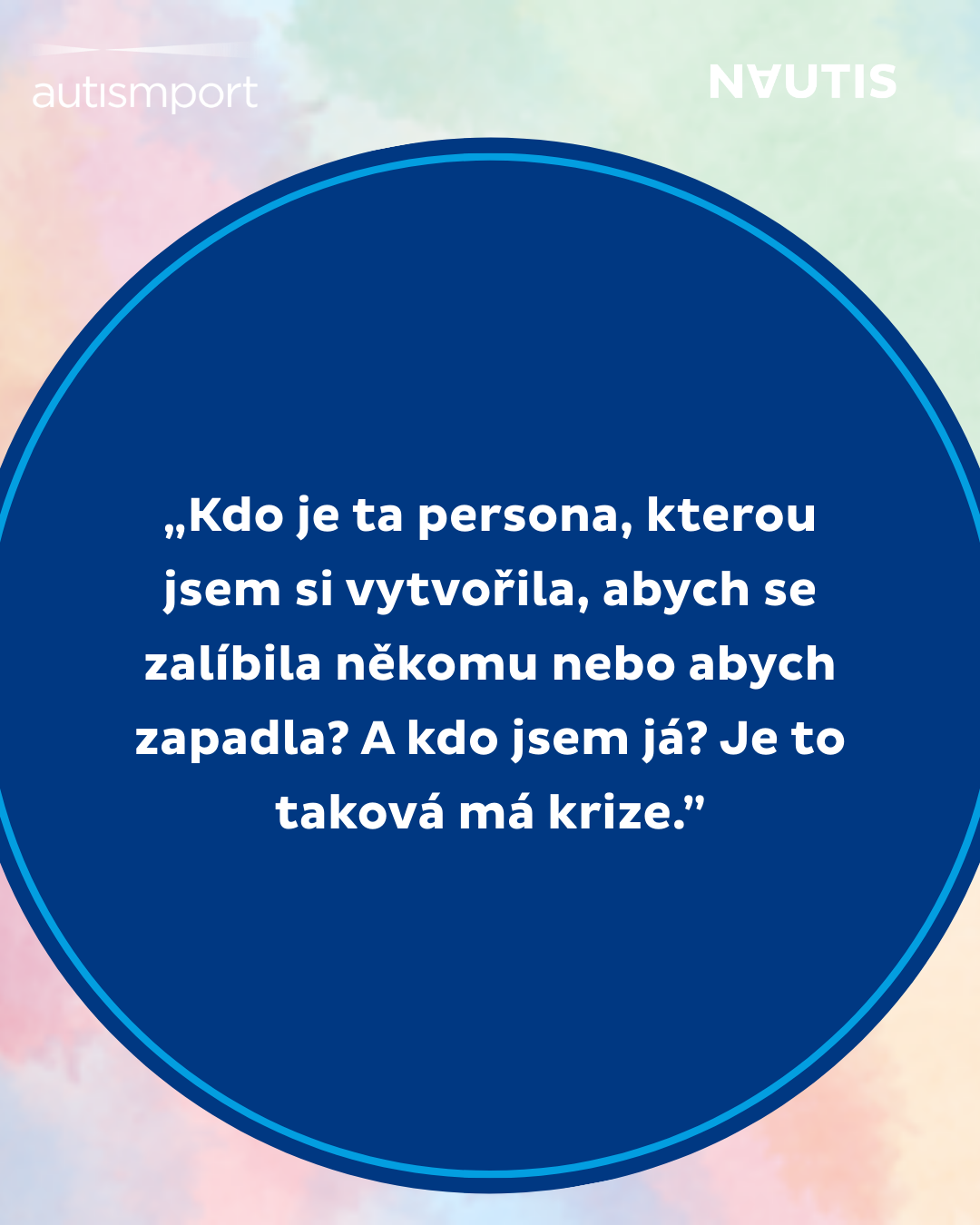 „Diagnóza autismu mi pomohla si tyto odlišnosti uvědomit a pochopit je, a taky je přijmout jako součást mé osobnosti. Snažím se, abych se necítila trapně nebo méněcenně, když se můj autismus ,projeví´. Autistické chování může být i užitečné, upozorní ostatní, aby mi dali víc prostoru nebo mě víc podpořili a pro mě je to signál toho, že je zapotřebí se začít víc hlídat a využívat strategie, které mi pomáhají předejít zhroucení.