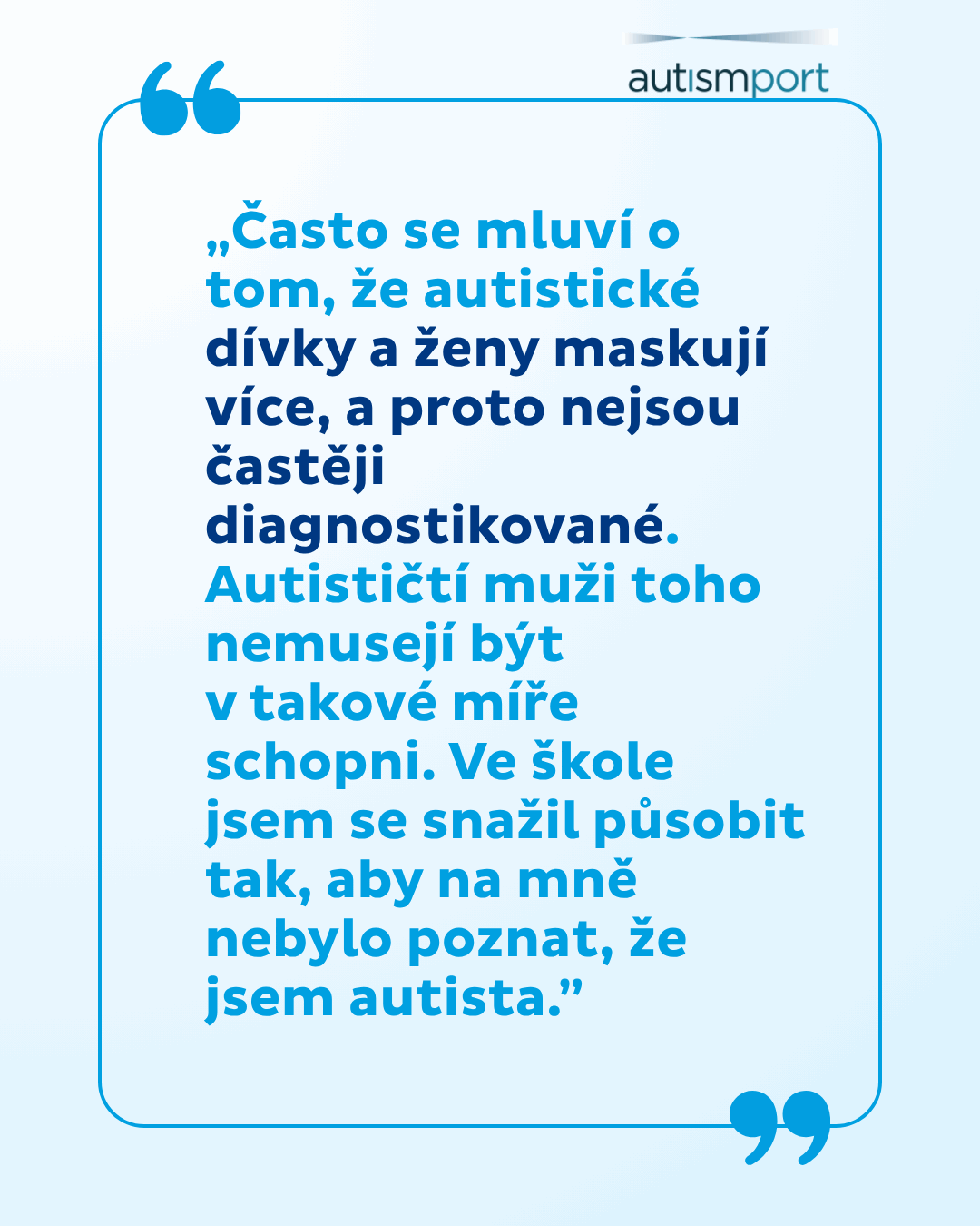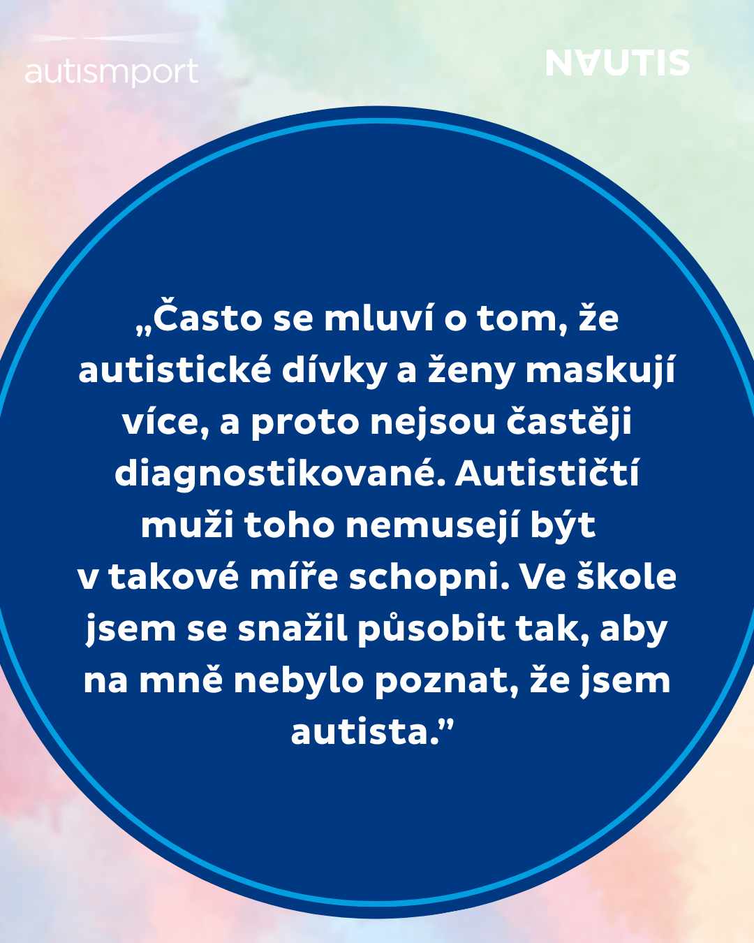 Často se mluví o tom, že autistické dívky a ženy maskují více, a proto častěji nejsou diagnostikované. Autističtí muži toho nemusejí být často v takové míře schopni. Ve škole jsem se snažil působit tak, aby na mně nebylo poznat, že jsem autista. Až když mi bylo asi 29 let, začal jsem chodit na živé knihovny do škol a začal vyprávět o svých zkušenostech a už mi nevadí mluvit o tom, že mám Aspergerův syndrom. Do té doby to o mně asi mnoho lidí nevědělo, jen si zřejmě mysleli, že jsem jiný.